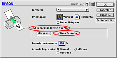 Em Macintosh, seleccione as caixas de verificação Impressão Frente e Verso e Livro Dobrado no menu Definir Página.