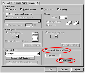 Em Windows, seleccione as caixas de verificação Impressão Frente e Verso e Livro Dobrado no menu Esquema de Página.