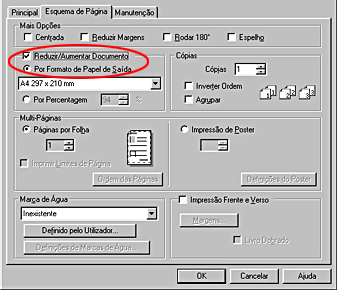 Em Windows, seleccione a caixa de verificação Reduzir/Aumentar Documento e seleccione a opção Por Formato de Papel de Saída no menu de Esquema de Página.