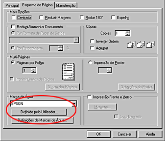![]() | Em Windows, seleccione a marca de água pretendida a partir da respectiva lista situada no menu de Esquema de Página e, em seguida, faça clique na tecla Definições de Marcas de Água |