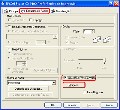 Faça clique no separador Esquema de Página e, em seguida, seleccione a caixa de verificação Impressão frente e verso.