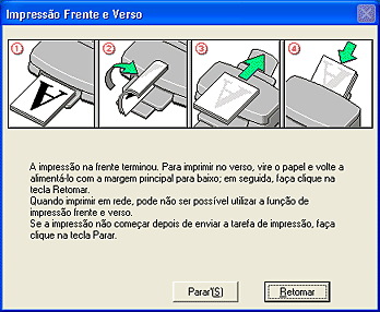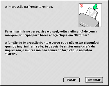 Quando voltar a colocar o papel, faça clique em Retomar para imprimir as páginas pares.