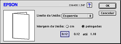 Seleccione a unidade de medida cm ou polegadas. Especifique a largura da margem de união. Pode definir um valor compreendido entre 3 e 30 mm ou entre 0,12 e 1,18 polegadas. Essa largura de margem será utilizada em ambos os lados da dobra. Por exemplo, se especificar um valor de 10 mm, será inserida uma margem de 20 mm (10 mm de cada lado da dobra).