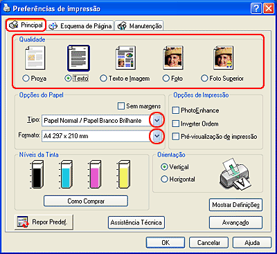 Faça clique no separador Principal e, em seguida, efectue a definição Opção de Qualidade. Para obter informações, consulte a ajuda interactiva.