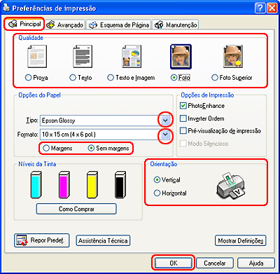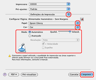 Seleccione XXX (Alimentador Automático - Sem Margens) se quiser imprimir fotografias sem margens.