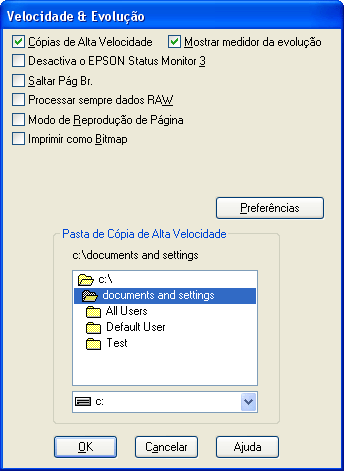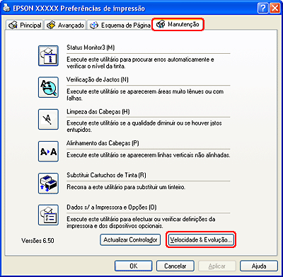 Pode aumentar a velocidade de impressão se seleccionar determinadas definições na janela Velocidade & Evolução. Faça clique na tecla Velocidade & Evolução na janela Manuteno do controlador de impressão.