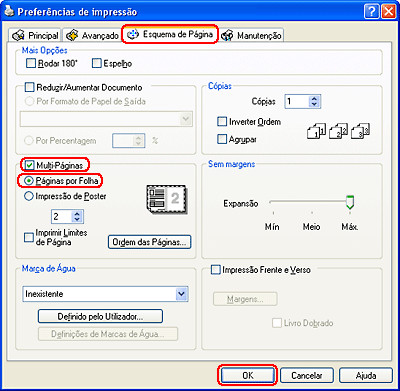 Imprime várias páginas do documento numa folha de papel. Pode seleccionar 1, 2, 4, 6, 9 ou 16.