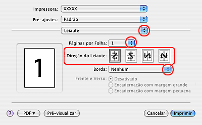 Seleccione uma das seguintes definições para a impressão de Páginas por Folha: