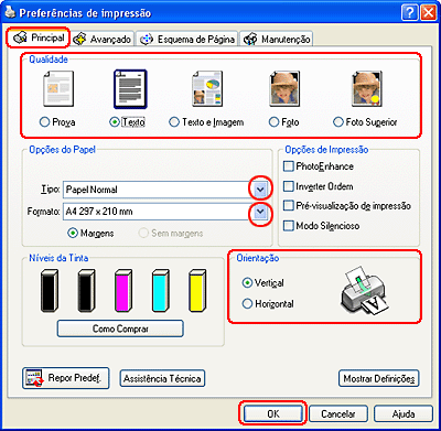 Seleccione as definições Papel, Cor e Modo adequadas. Para mais informações sobre as Definições de Impressão, consulte a ajuda interactiva.