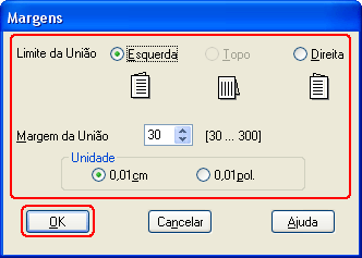 Seleccione a Unidade (cm ou polegadas). Em seguida, especifique a largura da margem de união. Pode definir um valor compreendido entre 0,3 e 3,0 cm ou entre 0,12 e 1,18 polegadas.