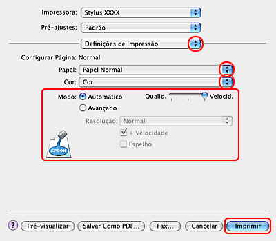 Seleccione as definições Papel, Cor e Modo adequadas. Para mais informações sobre as Definições de Impressão, consulte a ajuda interactiva.