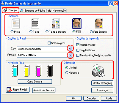 Seleccione Vertical (altura) ou Horizontal (largura) para alterar a orientação da impressão.