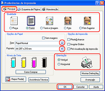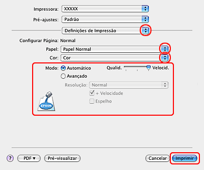 Seleccione as definições Papel, Cor e Modo adequadas. Para mais informações sobre as Definições de Impressão, consulte a ajuda interactiva.