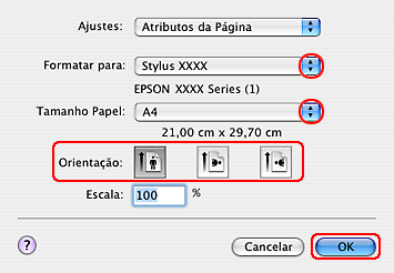 Seleccione a definição Formato (Size) adequada. Pode também definir um formato de papel personalizado. Para mais informações, consulte a ajuda interactiva.