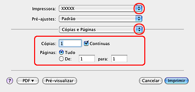 Seleccione a impressora que está a utilizar para a definição Impressora. Em seguida, efectue as definições Cópias & Páginas.