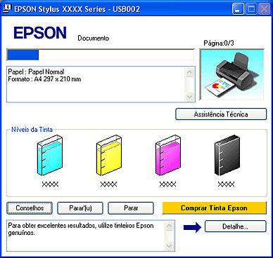 ConselhosNa caixa de texto da janela do medidor de evolução, aparecem sugestões para tirar o máximo partido do controlador de impressão Epson. Aparece uma nova sugestão de 30 em 30 segundos. Para obter mais informações sobre a sugestão que aparece na janela, faça clique na tecla Detalhes.