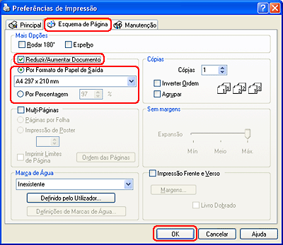 Pode imprimir com a função Ajustar à Página (Fit to Page), quando pretender imprimir, por exemplo, um documento de formato A4 em papel de outro formato.
