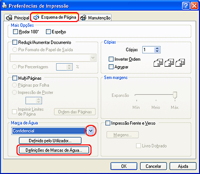 Faça clique em Definições de Marcas de Água.... Aparece a seguinte janela: