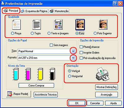 Para efectuar mais definições de impressão, faça clique na tecla Avançado. Para obter mais informações, faça clique na tecla Ajuda.