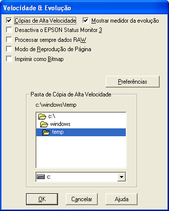 Para imprimir rapidamente várias cópias do documento, seleccione Cópias de Alta Velocidade. Esta função acelera a impressão utilizando o espaço em disco como memória cache para imprimir várias cópias de um documento.