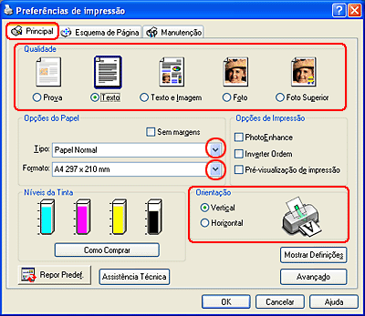 Seleccione Vertical (altura) ou Horizontal (largura) para alterar a orientação da impressão.