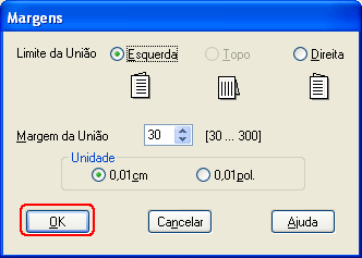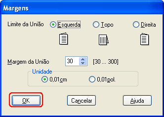 Seleccione a unidade de medida (cm ou polegadas). Em seguida, especifique a largura da margem de união. Pode definir um valor compreendido entre 0,3 e 3,0 cm ou entre 0,12 e 1,18 polegadas.