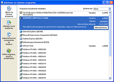 Faça clique em EPSON Scan na lista de programas instalados e em Alterar/Remover (Windows XP ou 2000) ou Adicionar/Remover (Windows Me ou 98).
