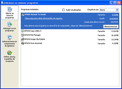 Faça clique em EPSON Attach to Email na lista de programas instalados e em Alterar/Remover (Windows XP ou 2000) ou Adicionar/Remover (Windows Me ou 98).
