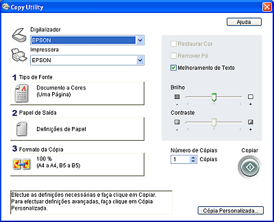 Se pretender pré-visualizar a digitalização antes de a imprimir ou efectuar definições de cópia adicionais, faça clique na tecla Cópia Personalizada situada na parte inferior da janela. Para mais informações sobre como utilizar as funções de cópia personalizada, faça clique em Ajuda no Copy Utility.