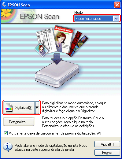 Se a definição de Modo situada no canto superior direito da janela estiver definida para Modo Automático, faça clique na tecla Digitalizar. Para mais informações sobre como efectuar definições opcionais, consulte Utilizar o Modo Automático.