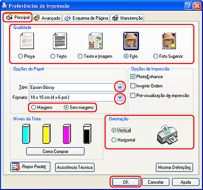 Faça clique em OK para fechar a janela de definições da impressora.