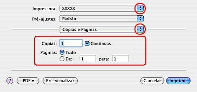 Seleccione a impressora que está a utilizar para a definição Impressora. Em seguida, efectue as definições Cópias & Páginas.