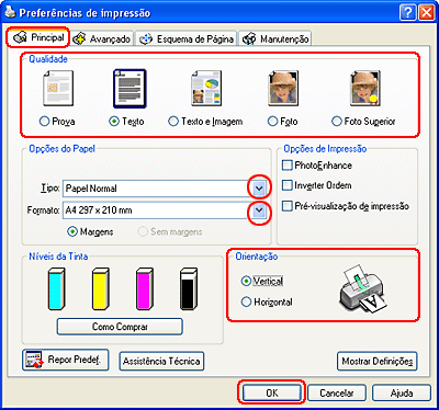 Seleccione as definições Papel, Cor e Modo adequadas. Para mais informações sobre as Definições de Impressão, consulte a ajuda interactiva.