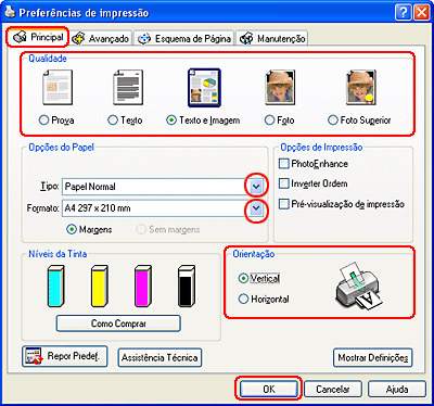 Seleccione as definições Papel, Cor e Modo adequadas. Para mais informações sobre as Definições de Impressão, consulte a ajuda interactiva.