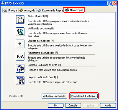 Pode aumentar a velocidade de impressão se seleccionar determinadas definições na janela Velocidade & Evolução (Speed & Progress). Faça clique na tecla Velocidade & Evolução na janela Manutenção do controlador de impressão.