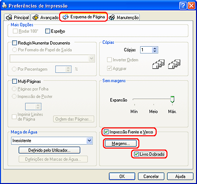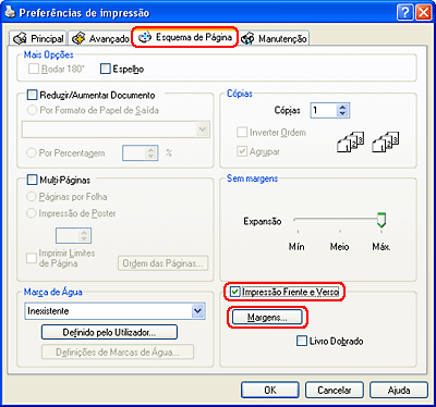Faça clique no separador Esquema de Página e, em seguida, seleccione a caixa de verificação Impressão Frente e Verso.