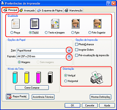 Seleccione Vertical (altura) ou Horizontal (largura) para alterar a orientação da impressão.