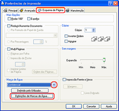 Faça clique em Definições de Marcas de Água.... Aparece a seguinte janela: