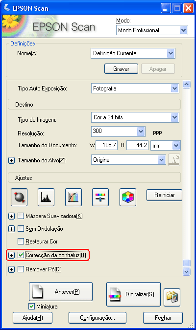 Execute as seguintes operações para corrigir fotografias com contraluz utilizando o Epson Scan: