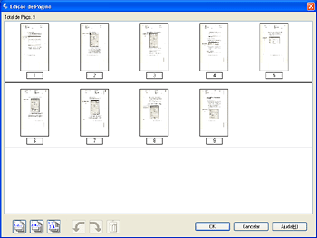 A janela Edição de Página apresenta miniaturas de cada página digitalizada. Pode utilizar as ferramentas situadas por baixo da janela Edição de Página para seleccionar, rodar, reordenar e apagar páginas do documento. Para mais informações, faça clique na tecla Ajuda.