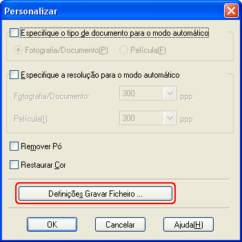 Faça clique na tecla Digitalizar. Aparece a janela Definições Gravar Ficheiro (File Save Settings).