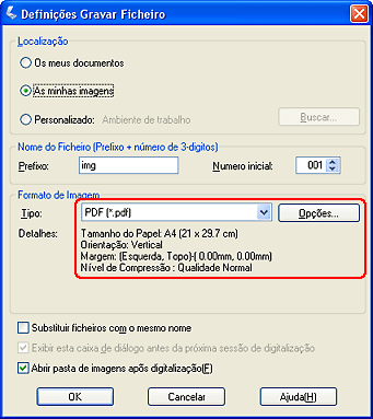 Seleccione PDF para a definição de tipo de ficheiro. As definições de Tamanho do Papel (Paper Size), Orientação (Orientation), Margem (Margin) e Compressão (Compression) são apresentadas por baixo dessa opção.