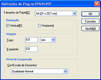 Se necessitar de alterar qualquer uma das definições de PDF, faça clique na tecla Opções. Aparece a janela Definições do Plug-in Epson PDF.