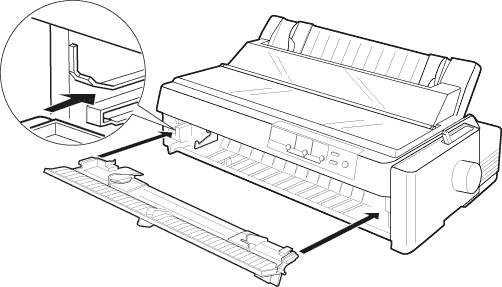 Instale o suporte de admissão de papel frontal empurrando-o através das ranhuras de montagem da impressora, tal como se mostra abaixo. Depois, feche o suporte de admissão de papel frontal.