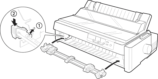 Introduza o tractor nas ranhuras de montagem da impressora e faça pressão em ambas as extremidades do tractor para ter a certeza de que fica firmemente encaixado.