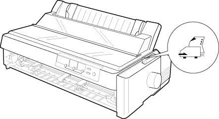 Coloque a alavanca de selecção do sistema de alimentação na posição do tractor anterior frontal. Além disso, coloque a alavanca reguladora da espessura do papel (localizada debaixo da tampa da impressora) na posição correspondente à espessura do papel que está a usar.