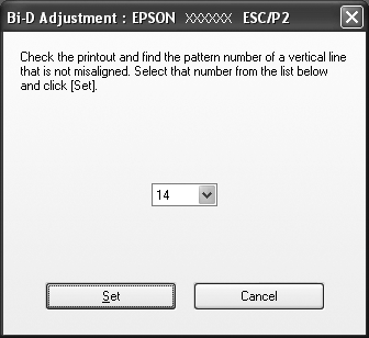 Observe os padrões de ajuste e veja qual a linha vertical que está melhor alinhada. Em seguida, seleccione o número da linha correspondente na janela Bi-D Adjustment (Ajuste bidireccional).