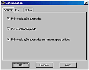Faça clique na tecla Configuração na janela do modo Manual para abrir a caixa de diálogo Configuração, onde pode efectuar várias definições de configuração relacionadas com a janela de pré-visualização, a imagem pré-visualizada e o ajuste de cores.