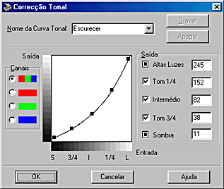 Correcção Tonal na janela do modo Manual para abrir a caixa de diálogo Correcção Tonal. A lista Nome da Curva Tonal e a caixa de diálogo Correcção Tonal põe à sua disposição as seis curvas tonais mais comuns.