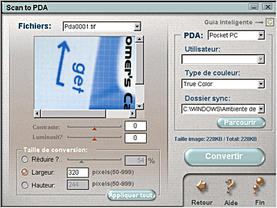 Utilize esta aplicação para digitalizar e converter uma imagem num formato de ficheiro compatível com PDA. Quando inicia esta aplicação, a imagem é digitalizada a partir do EPSON TWAIN e é apresentada na caixa de diálogo do assistente de verificação. Faça clique em Terminar e aparecerá a caixa de diálogo apresentada em seguida. Faça clique em Convert para exportar a imagem para a pasta Sync ou para a pasta especificada. Para mais informações, consulte a documentação do EPSON Smart Panel.
